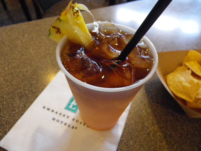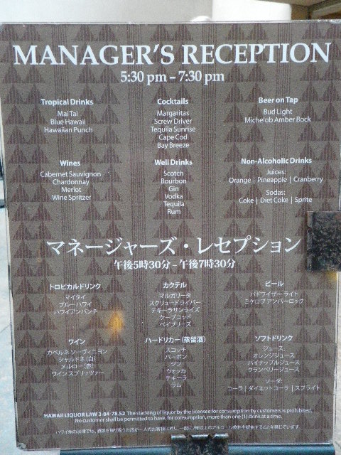 宿泊者対象にプールサイドでカクテル、ワイン、ビールなどのアルコール類や軽食の提供があります。アルコールの内容はかなり充実していてこれが無料(チップは必要)なのはとてもお値打ちです!夕飯前に生演奏聴きながら1~2杯軽く飲んで夕食のお店に向かうのもいいです。実際我が家は夕食前に何杯か頂いてから夜のワイキキレストランへ繰り出してました。チップですが、1~2杯につき$1を渡してました。