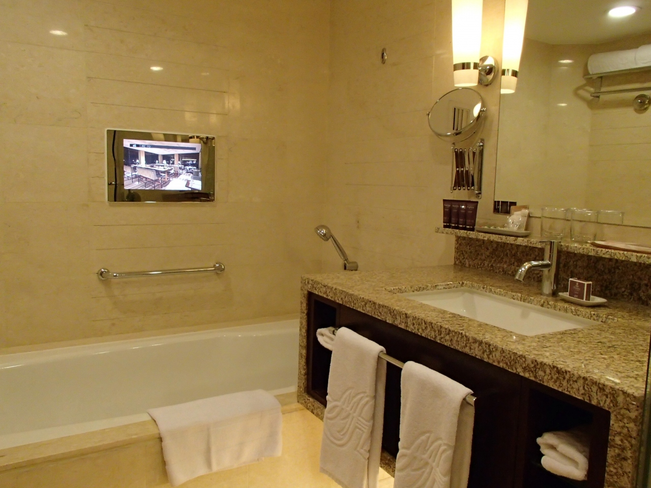 室内も広く、調度品や建具は古いですが手の込んだ高級品が備えられて風格を感じます。洗面室も広くてバスタブとシャワーブースが別にあるタイプ。バスルームにテレビも付いており、高級感も清潔感も文句ないレベルでした。