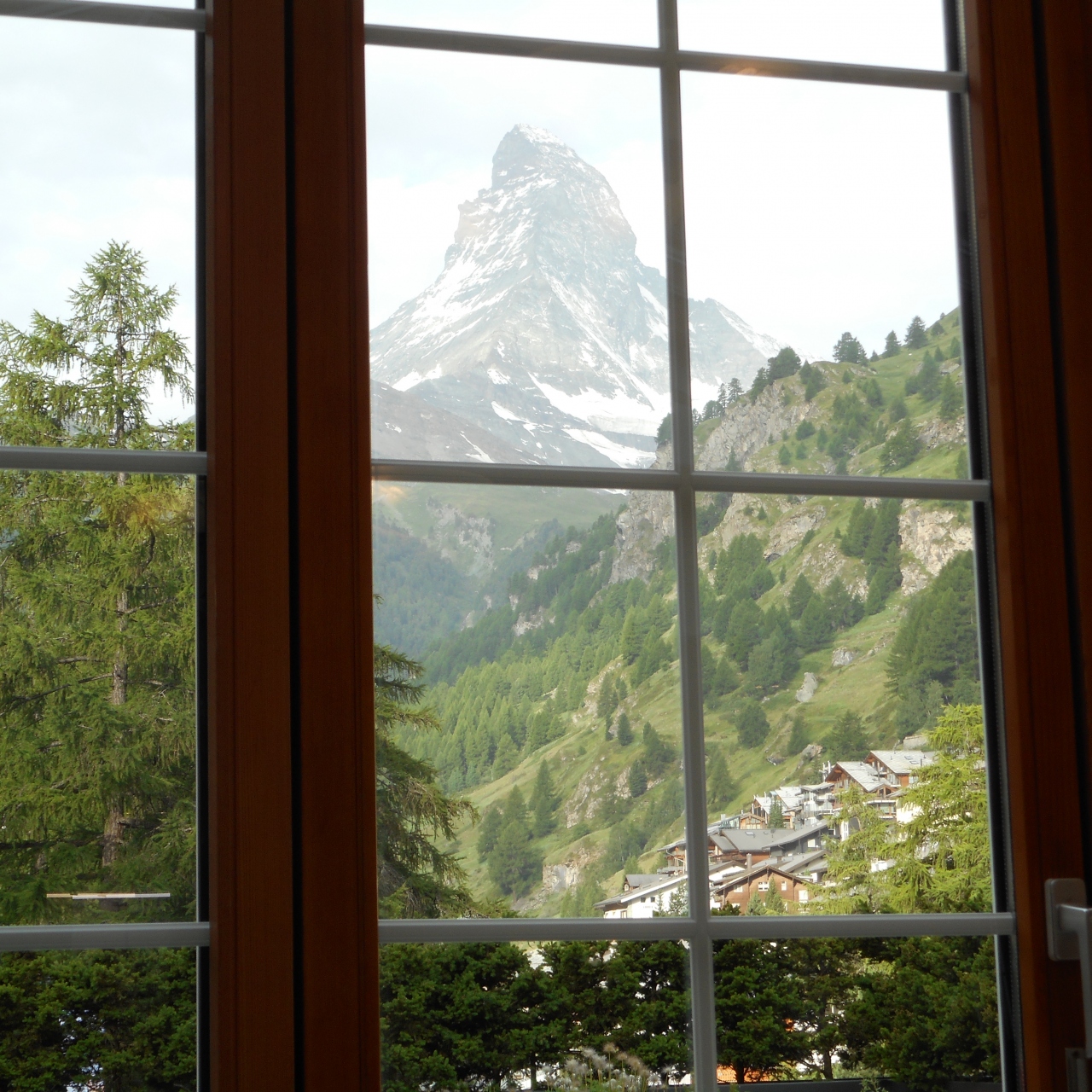 ツェルマットマラソンで利用しました。半年くらい前にマッターホルンビューの部屋を予約。日本のホテルから考えれば高いかもしれませんが、スイスの物価や立地を考えれば大満足です。早めの予約だったからかほとんどマッターホルンフロントでした。観光やマラソンで部屋にいないのでは?とも思いましたが、夜9時くらいまで明るいし、夜でもマッターホルンは楽しめます。一人なのもありテイクアウトで食事をすることが多かったのですが、テラスでマッターホルンを見ながら食べていました。下のレストランで持参したポットにお湯をもらい、コーヒーを飲んだりと大正解でした。朝食のレストランからも見えます。部屋に冷蔵庫がなかったのですが、お願いしたら小さいですが用意してくれました。マラソンの当日も朝早く朝食時間外だったのですが、お願いしたら前の晩までにランチボックスを用意してくれました。サンドイッチ2個、バナナ、チーズ、スナック、ジェル、水、ジュースなどいっぱいです。毎朝食も種類が十分ありました。下のレストランもかなり人気のようでした。行くときは電話が面倒なので歩いて行きましたが帰りは駅まで無料送迎してくれました。フロントのお姉さんたちは英語が話せますし、親切でした。みなさんにおすすめできるホテルです。