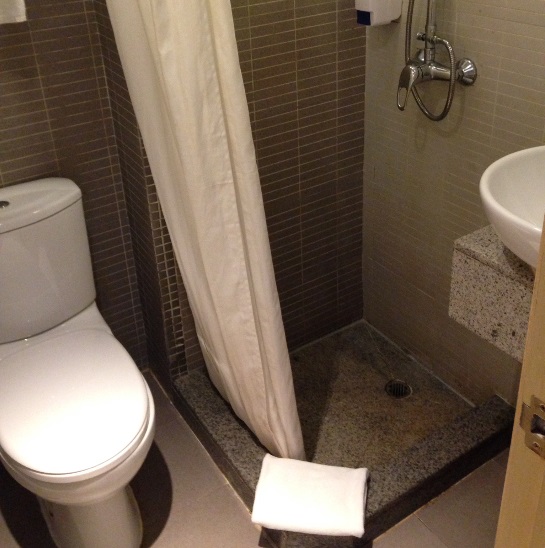 部屋は狭い。シャワーとトイレの仕切りはカーテンだけ。空の冷蔵庫がある。