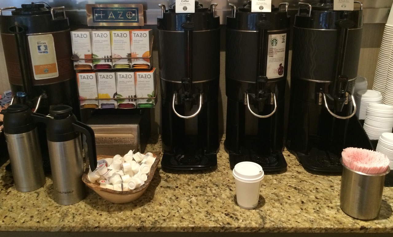また毎朝ロビーにスターバックスのコーヒーが置いてあり、無料でいただけます。但し補充はされないようなので、遅く行くとデカフェしか残っていない事もありました。