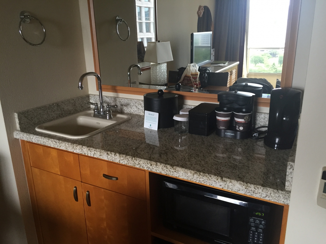 ウェットバーには電子レンジ、小さな冷蔵庫、小さめシンク、コーヒーメーカーがあります。
