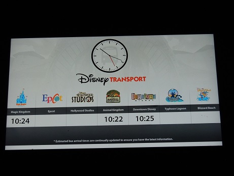 同じアニマルキングダムロッジ内にあるキダニヴィレッジ。ジャンボハウスをさらに先に行ったところにあります。少し奥まったところにあり、パークに頻繁に行き来するには適しませんが、ゆったりのんびり過ごすことが出来ます。バス停にはバスの時刻表?みたいなものがあって、モニターで次のバスの到着時間が分かります。これが思った以上に正確で驚いてしまいました。