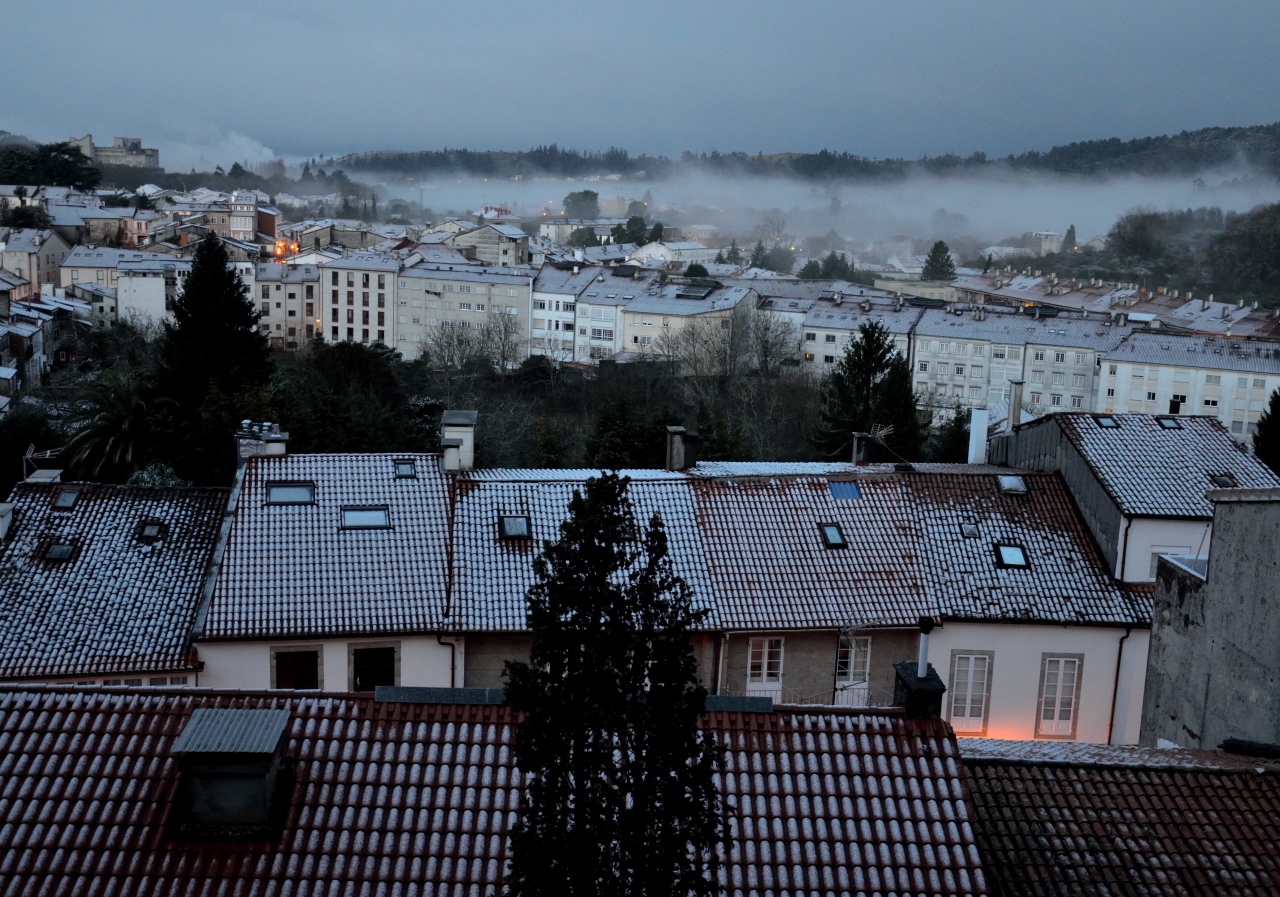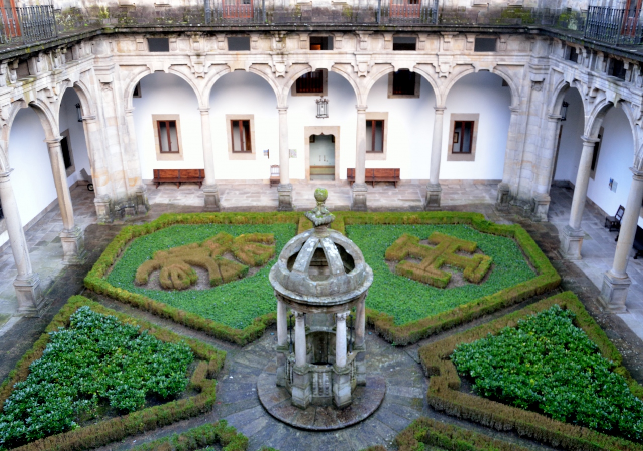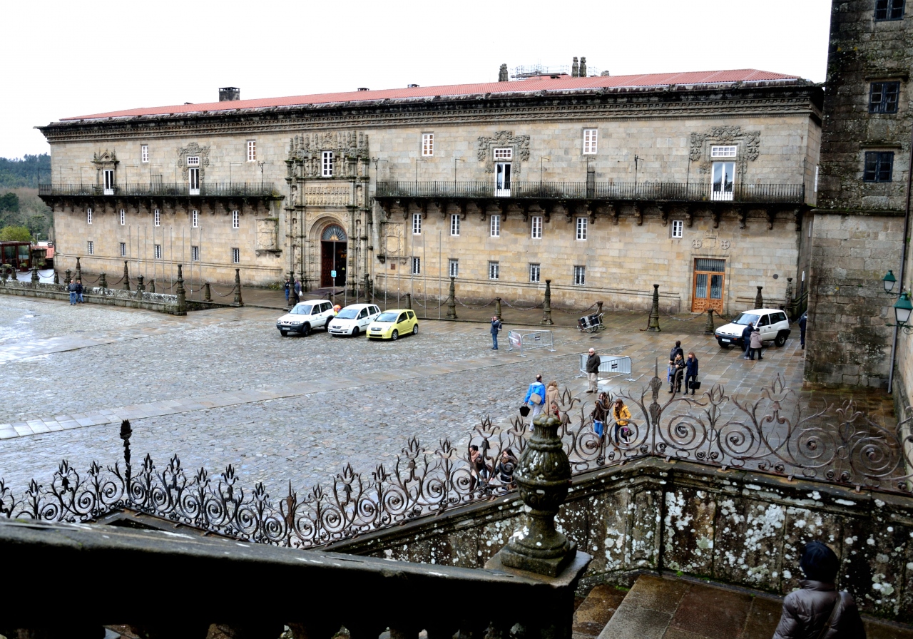こちらも人気のパラドールです。大聖堂前の広場を囲む一辺を占めています。広場まで車を乗り入れてよいものかと心配しながら、ゆっくりと車を玄関前まで進めました。ドアマンがやってきて、車のキーを預かってくれました。駐車場は少し離れたところにあるようです。中に入ると想像していた以上に素晴らしい。4つの中庭がそれぞれ表情を異にし、その周りを客室が取り囲んでいます。アンティークな調度品に囲まれた、趣のある広い部屋です。ドアの鍵の開閉に少々難ありでしたが、古いのでやむなしとします。巡礼路を少し歩いてみようと、モンテ・ド・ゴソ(歓喜の丘)までタクシーで行き、巡礼路最後の4キロ程を歩いて大聖堂まで戻ってきました。翌朝窓を開けるとうっすらと雪景色、周りの家々の褐色の屋根に雪がかかっているのは何とも綺麗でした。喜んでばかりはいられません、今日は次のパラドールに向かって山越えの道です。道路の積雪を心配しながら、10時頃になってようやく出発しました。