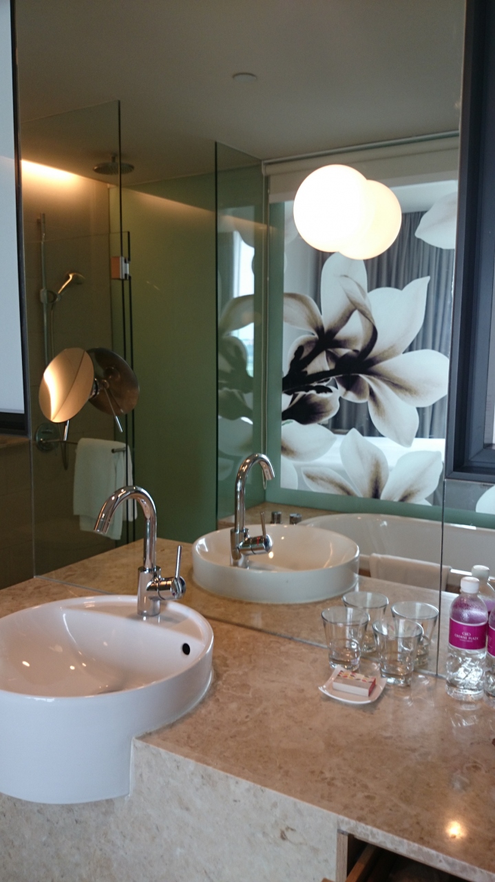 ツインでの宿泊、お部屋は広く、一面の窓からはスカイトレインを挟んで飛行機の着陸が見れました。バスルームもバスタブと独立したシャワーブースがあり広々。アメニティのパッケージはオーラカイリーのプリントでした。