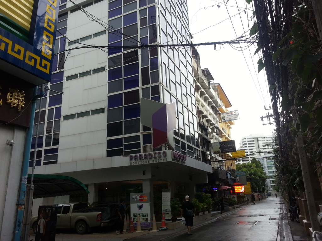 スクンビット通りの偶数側で隣は公園なので静か。アソーク駅、ナナ駅の間でスクンビット通りの対面はテルメ。通りからは10メートル程なのですぐに見つかる。
