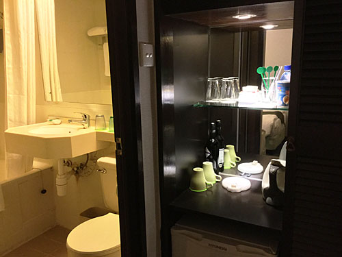 建物は古そうですが、部屋は清潔に維持されており日本のビジネスホテルのような感じで居心地は悪くないです。設備は、エアコン、液晶テレビ、冷蔵庫、ミニバーなど一通り揃っており、風呂場はバスタブ付でシャワーの水圧も強く快適に浴びることができました。洗面台には壁掛式ヘアドライアーもあり、アメニティーは、歯磨きセット、クシ、シャワーキャップ、使い捨てスリッパ。シャンプーとボディーソープは備え付けタイプでした。