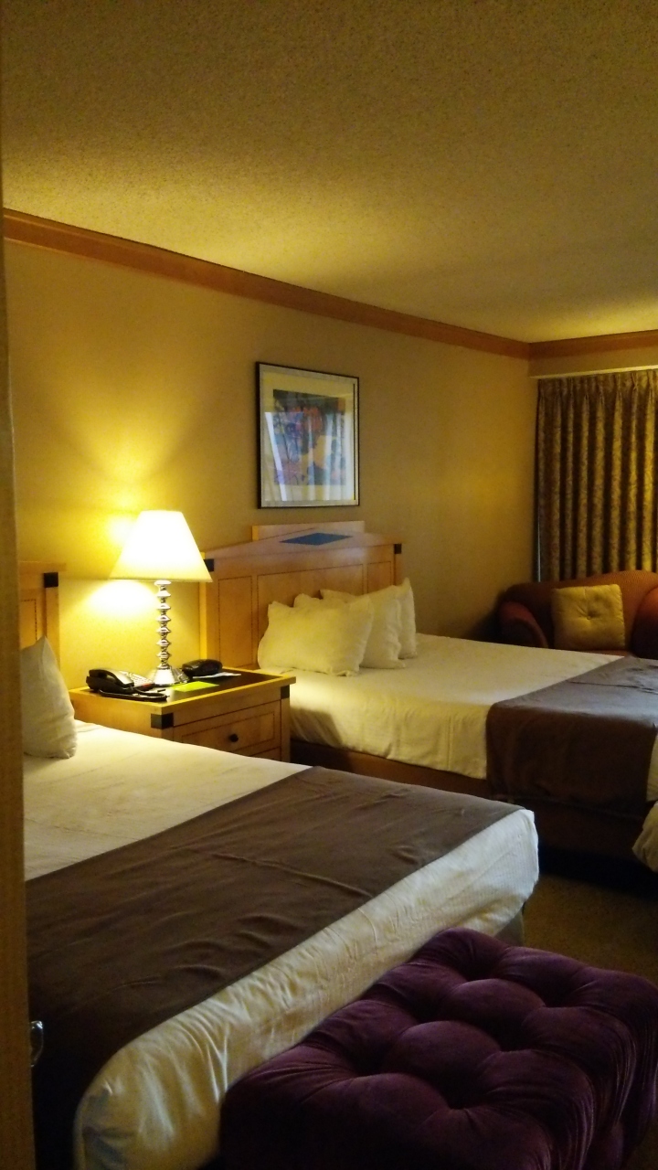 3人で利用、トリプル利用可能という事でこのホテルに決めました。お部屋はエキストラベッドを入れても余裕の広さでした。大きめのソファーやテーブルも有り、ゆっくりくつろげるお部屋でした。チェックイン時にストリップ通りに面してるお部屋を希望したので、2棟あるうちの奥側の棟になりました。建物で半分隠れてはいたものの、部屋からベラッジオの噴水が見えました。フォーコーナーに面してはいますが、通りから奥まっているので部屋まで遠いのと、お風呂のシャワーが固定式だったこと、これと言って特徴のないホテルだったのでマイナス☆一つの評価にしました。