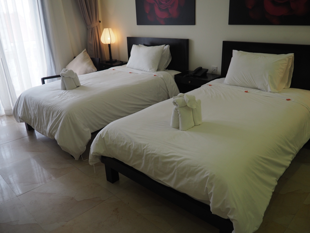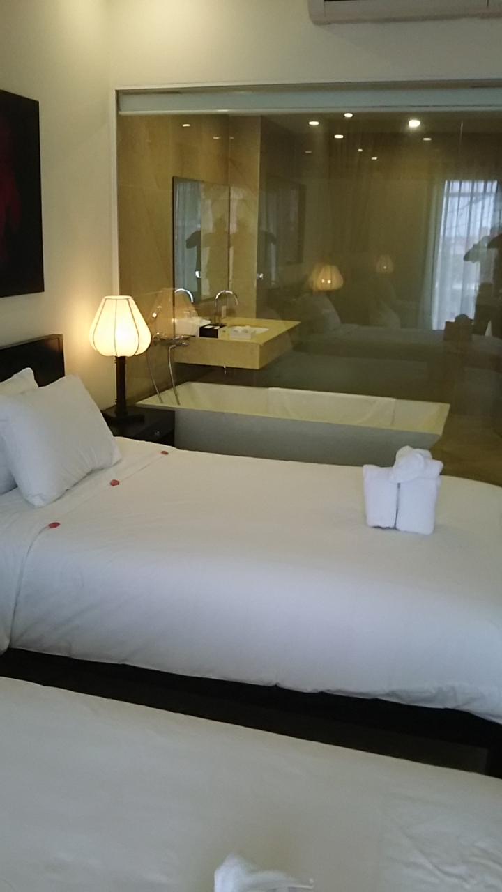 部屋は1人でしたがツインルームに宿泊、広くてゆったり出来ました。タオルメーキングが可愛らしく出迎えてくれます。バスルームはガラス張り開放感があります。