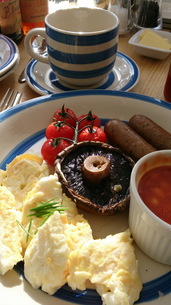 朝食はイングリッシュブレックファーストは勿論のこと、その他いろいろとメニューがあり、オーナーに伝えて作ってもらいます。私は肉を食べないので、ベジタリアン用のイングリッシュブレックファーストを頼みました。野菜のソーセージなどでつくられていました。