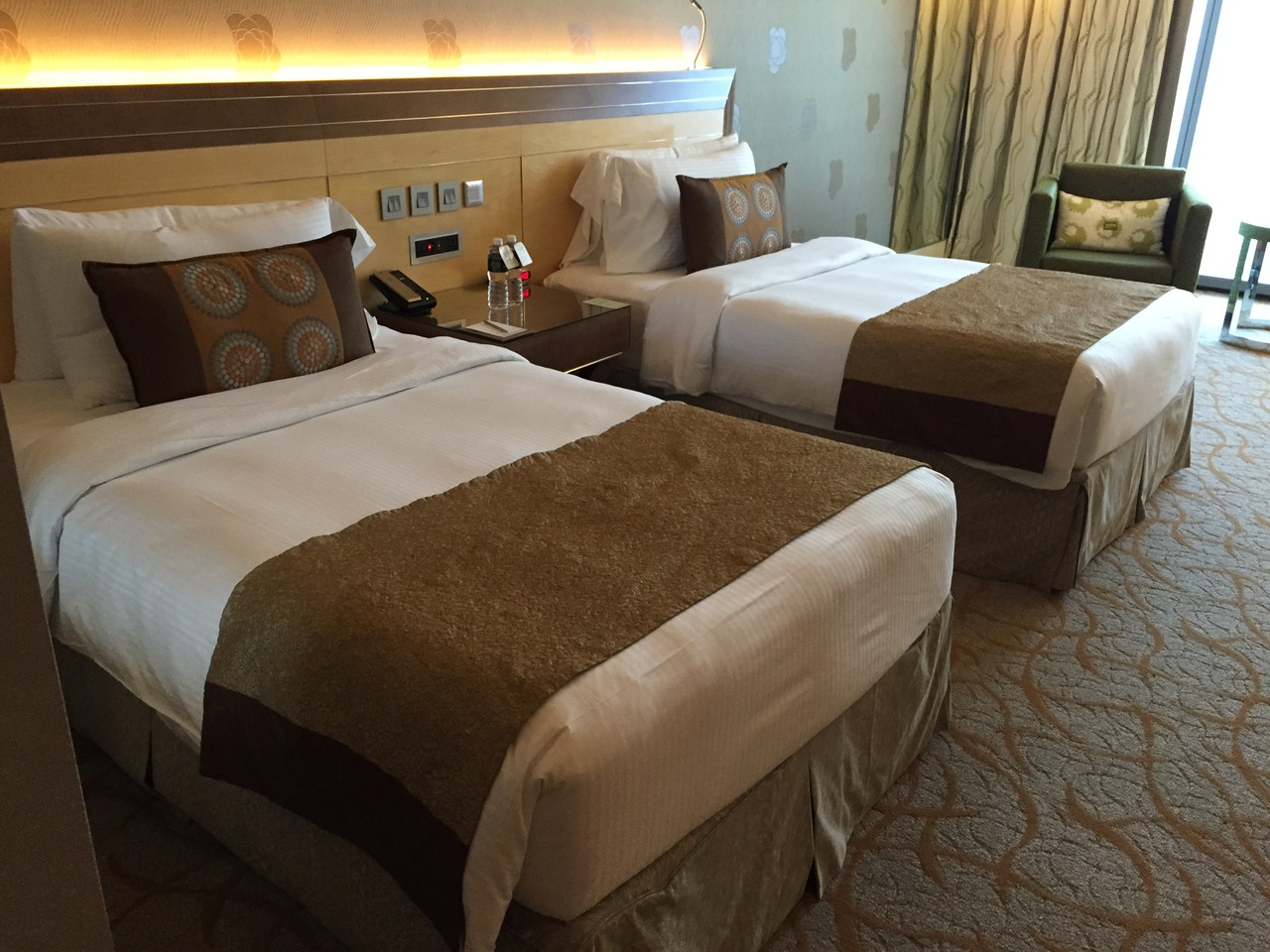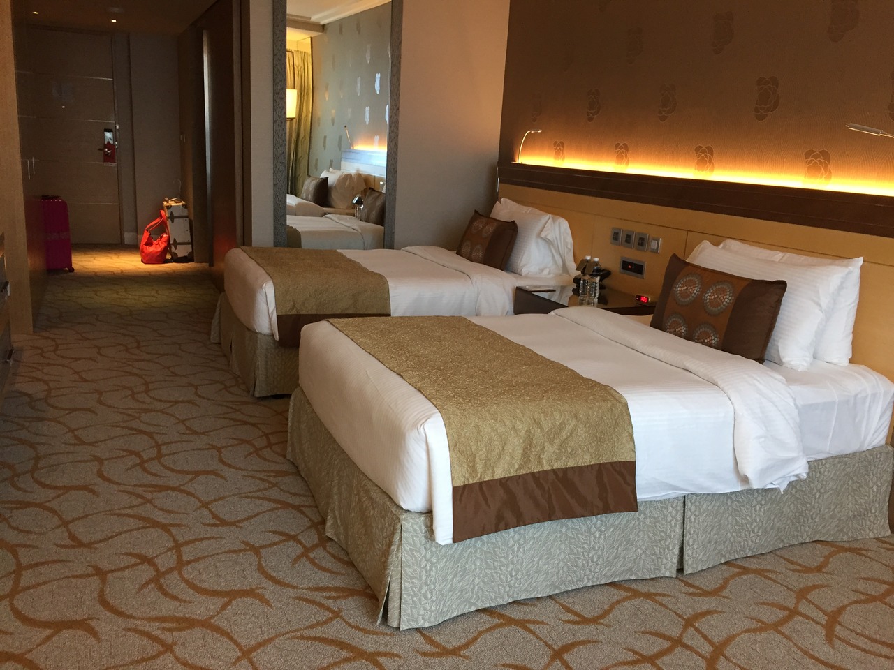 格安パッケージツアーだったので、部屋指定なし、ベッド数確約なし、デラックスルームの1番下のランクのプランだったんですが、フロントで、ツイン,高層階希望と、伝えたところ、