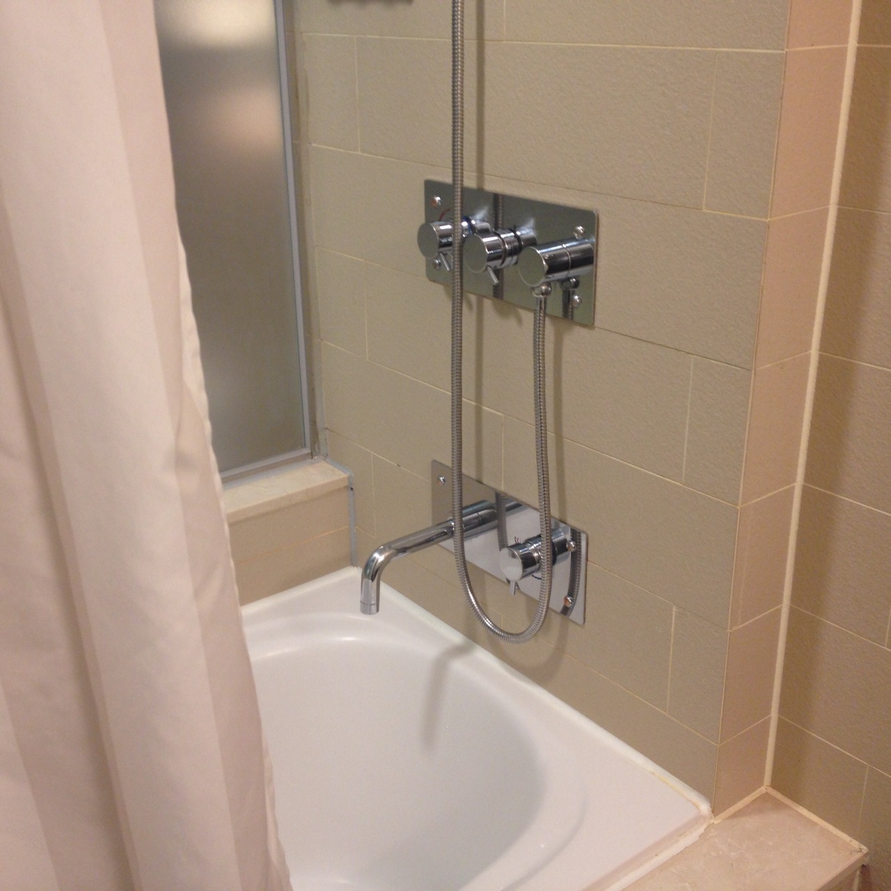 ツインルーム利用でした。バスルームはバスタブ付き、シャワーは天井からのモノと取手付きのシャワーと2種類ありました。電気プラグについては1箇所日本製コンセントが使える場所がありましたが他の箇所は使えないものでしたので外国旅行用プラグを持っていくと同時に多くの充電などができると思います。