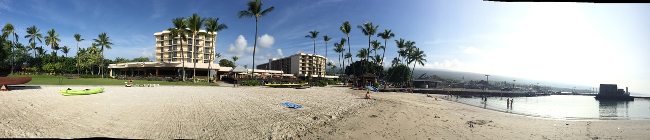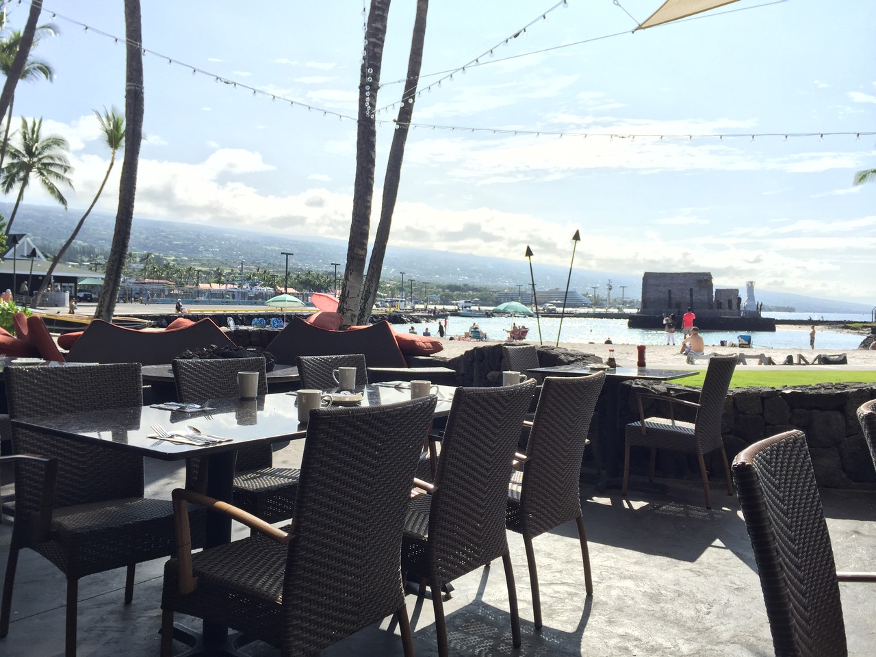 コナ北部の大型リゾートホテルよりも町中のホテルという感じですが、海に面しており、ホテルの前にも静かなビーチがちょっとだけあります。コナの市街地(といっても田舎町ですが)なので、周辺にレストランや商店があり、徒歩でもバリエーションのある食事や観光が楽しめると思います。ホテル内にレストランは一軒ですが、珈琲ストアやコンビニが中にあるので便利。本格的なルアウもやっていて、当地ゆかりのカメハメハ王も登場されます。プールやスパ、ヨガのレッスンなどもありますよ。リゾートフィーをとらないので比較的リーズナブル。