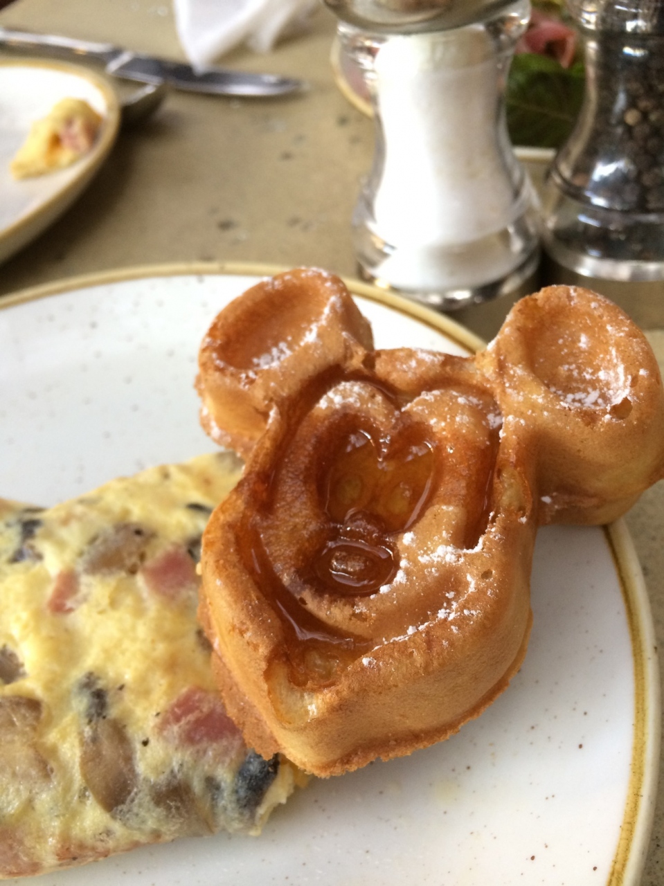 その後はブッフェスタイルの朝食です。ミッキー型のワッフルやエッグベネディクトなどが楽しめます。