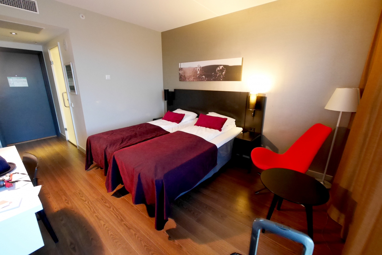 中国人の団体客が多い.レセプションの女性が,私たちが日本人だとわかって「今日は中国人のグループ7つもあった」といっていた.うるささとマナーから,結論から言えばこのホテルはお勧めしない.部屋も朝食も割とよく,890NOK(Wikipedia)13000円でコストベネフィットは最高なのだが..部屋はツインのシングルユース,机も広くて,居心地は良かった.また空港ホテルだが空港からはタクシーを使って約4?と不便