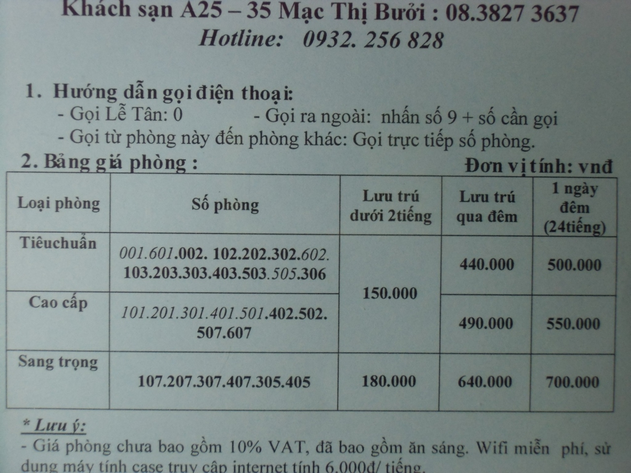 年末から10連泊しています。昨年の全面改装後も、行く度に少しずつ設備が良くなっています。ドライヤーが小型から大型に変わり、時計が新しくなり、ドアの鍵がカードーキーに変わり、ネット接続がホテルで同じ回線だったのが、2~3室で1回線になり、部屋に備え付けのセフティボックスが新しくなり、さらに1月1日からは日めくりカレンダーが設置されました。料金は前と同じで、ダブルベッド1つ窓なしが50万ドン、窓有りが55万ドン、ダブルベッド2つ窓ありが70万ドン、各部屋税金別、朝食無料です。