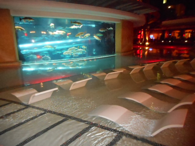 夜、8:00からのフリーモントエクスペリエンスショーを見物しながら、庶民的なこのホテルでカジノして、金塊を見て、円柱で滑りながら、脇で魚が泳ぐプールの見物をしながら、過ごします。プールでカジノもでき、こんな素敵なプールは滅多にないです。