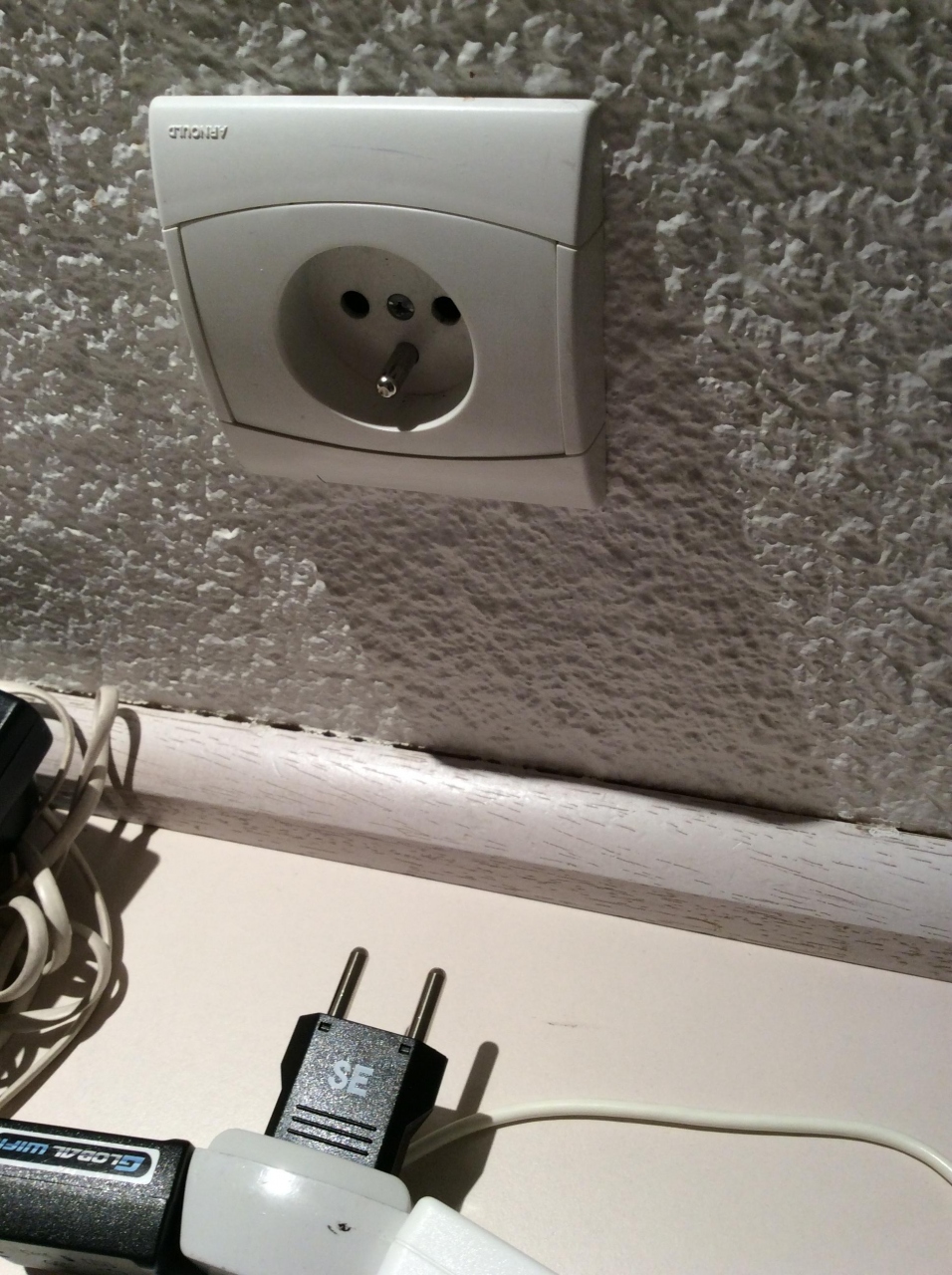 コンセントは机の所とドライヤーの横にあります。少し窪んでいるので、マルチタイプの大きな物だと入らないかもしれないので、100~200円の単純な変換器を2つくらいと、三ツ口があれば便利だと思います。