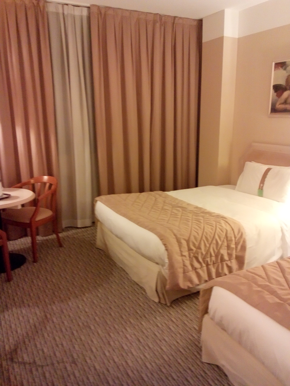 ベッドはセミダブルだと思いますが、大きくてぐっすりと眠れました。部屋には電気ポット、コーヒーカップ、お茶のセットがあり、氷は各階のエレベーターのところで無料で取れるようになっていました。フロントのある階で出ると目の前にレストランがありました。ホテルのレストランも値段は安いように感じました。窓から左は廃墟に見えましたが、右はビルが立ち並びビジネス街のようでした。