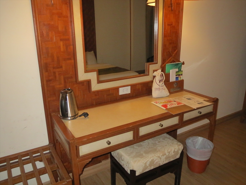 デスクは鏡台と兼ねています。コンセントが二つ付いているので便利です。220Vですが、日本のコンセントタイプが使えます。