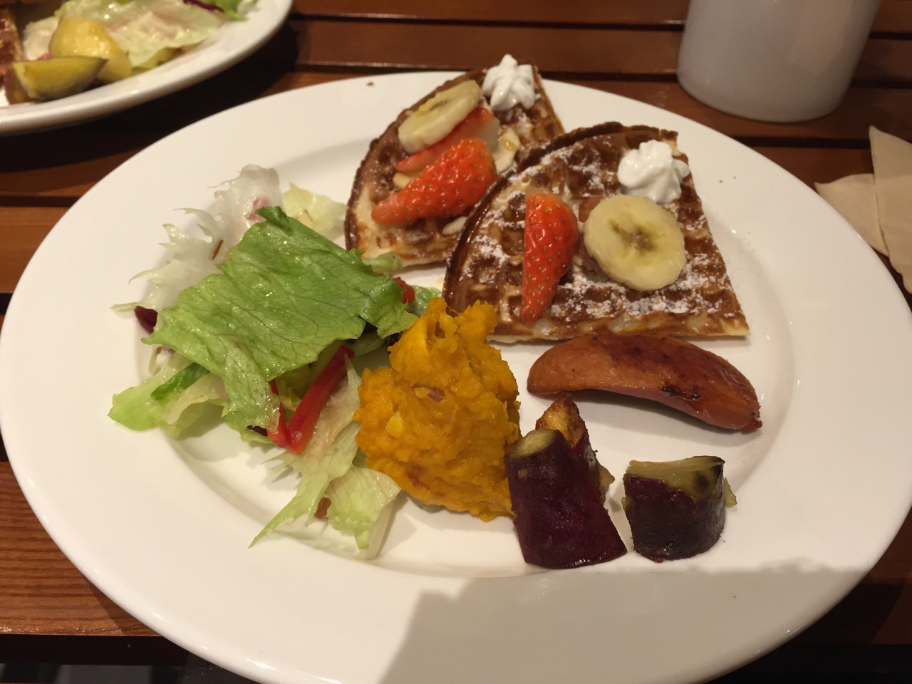 • 2日目の朝食 ワッフルでした。ヨーグルト、フルーツもあります
