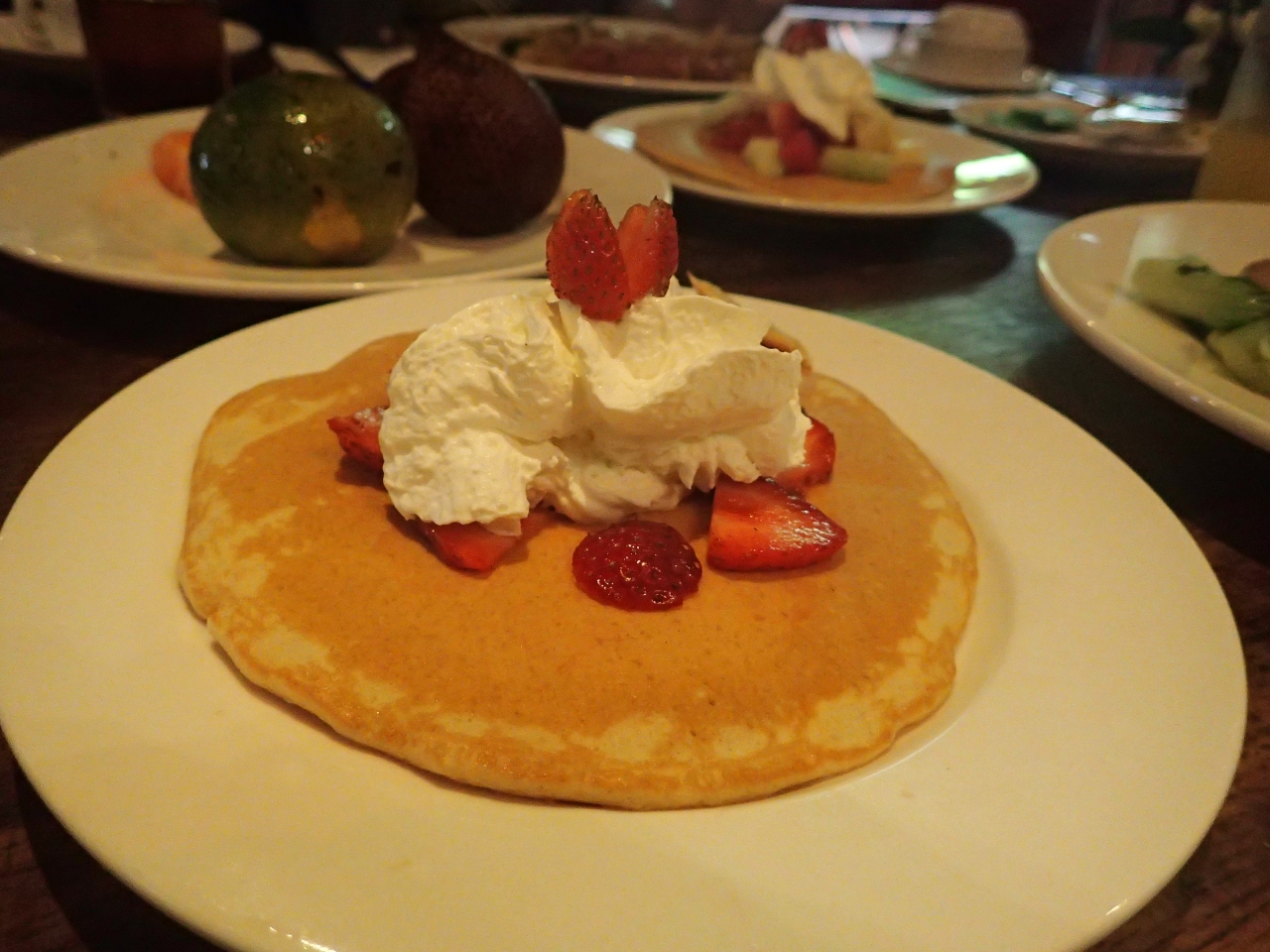 朝ごはんはとても豪華。中華系のおかずも充実しているし、うれしかったのは目の前で焼いてくれるパンケーキ。ホイップクリームとフルーツを添えて、席まで運んでくれる。