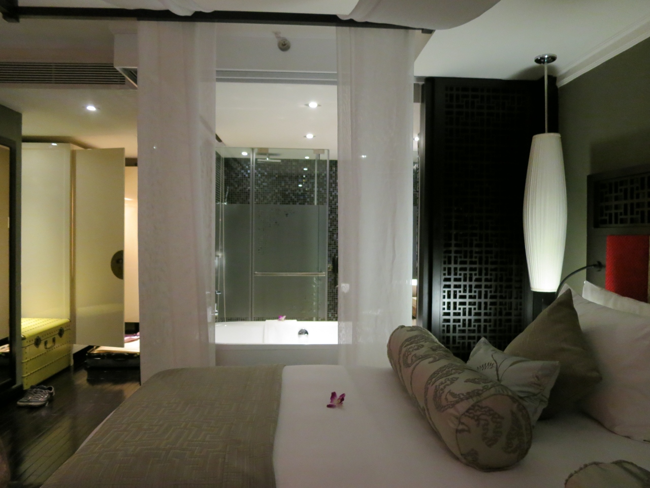 バスルームがベッドサイドから見通せ、ちょっとびっくりですが、格子戸で目隠しはできます。