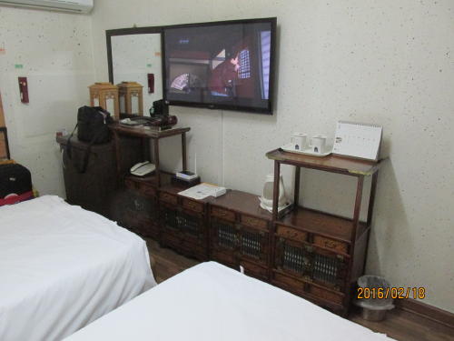 ツアー2日目は全州の漢城ホテルに宿泊しました。全州一の繁華街、商店街の真中に有ります。午後は表の通りでバスを降りて商店街を歩いて行きます。部屋はオンドル部屋でしたがベッドが入っていました。私はオンドル部屋が好きなのでベッドで無く布団にして欲しかった。バスタブが有りましたのでゆっくりお風呂に浸かって昼間の疲れを取りました。夜は商店街を散歩して見ました。スタバやケンタッキー、H&M、ノレパン、スポーツ用品、全州一の商店街なので何でもありました。朝食はホテルのバイキングでした。観光スポットの韓屋村も近く最高の立地です。繁華街なので夜遅くまで外が賑やかな時があるようですが冬ですので静かでした。最近改装したようで部屋も綺麗で、ベッドで無く布団だったら満点です。