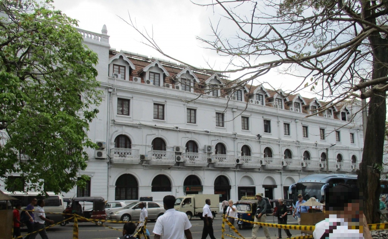 キャンディの町のど真ん中にある仏歯寺の正面に位置し、キャンディ胡を横に臨む場所にあるヨーロッピアンな雰囲気の漂うコロニアル建築の傑作と言われるクイーンズホテルです。