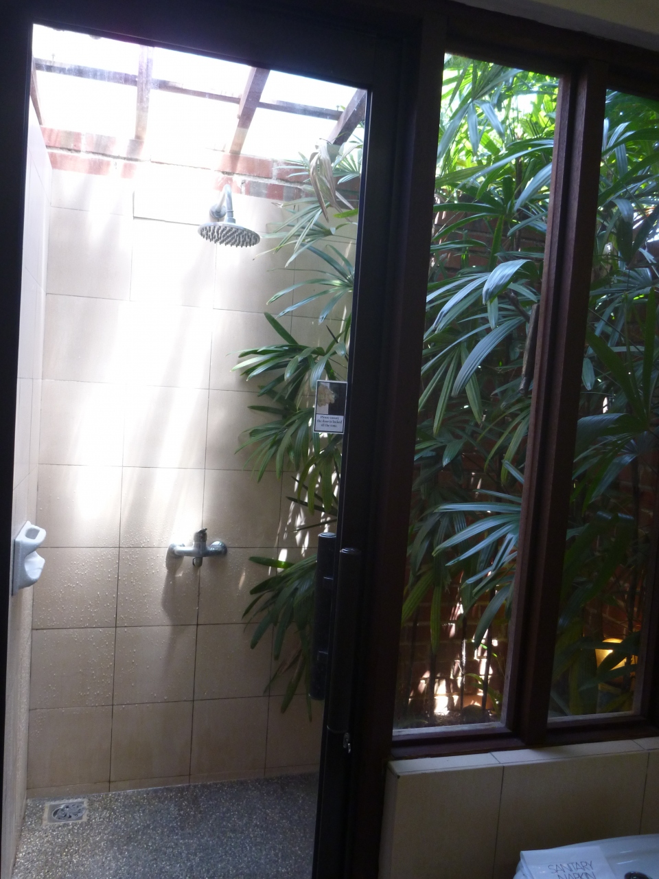 部屋はゴージャス感はありませんが、清潔にされていて、アメニティーもそろっています。シャワーが外にあり、夜はちょっとムーディーです。