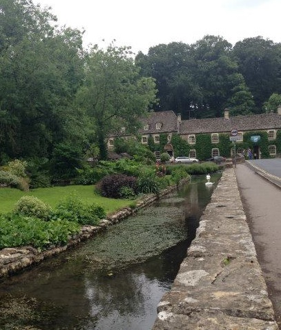 バイブリーのトラウトファーム前にある緑のツタが美しい石造りのホテル。