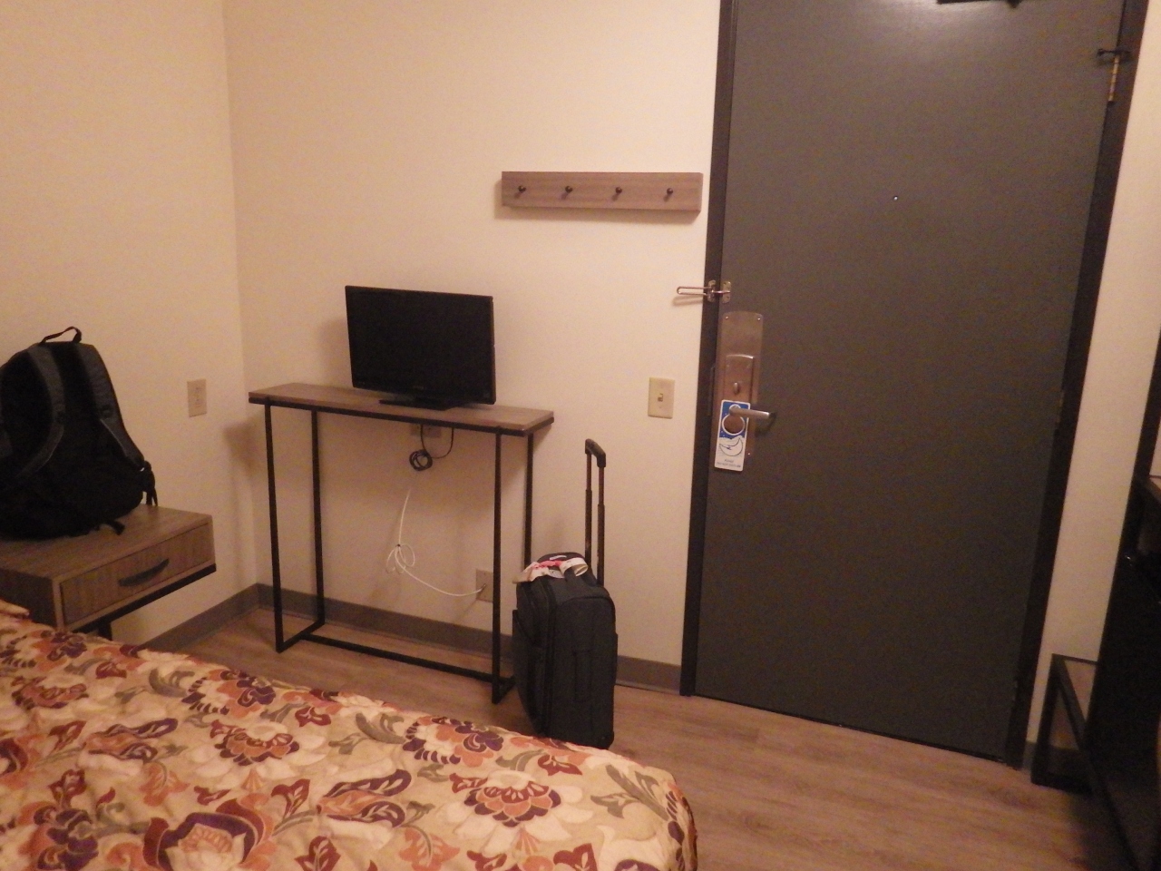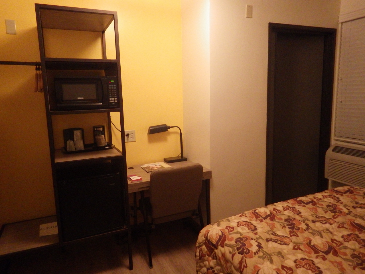 部屋は清潔感があり、冷蔵庫、電子レンジは重宝しました。広さは、一人なら十分な広さです。ロケーションは、ダウンタウンの地下鉄駅のすぐ近くで、とても便利な立地です。バスルームはシャワーのみ。ドライヤーはあります。石鹸とシャンプーがついていますが、シャンプーは上等ではありません。シャワーは、最初水しか出なくて、故障しているのかと思いましたが、引っ張ったり回したりしているうちにお湯が出るようになりました。冷蔵庫に製氷皿もありますが、廊下に製氷機もありました。コーヒーメーカーがあり、インスタントコーヒー2回分がついていました。使った分だけ補充してくれます。