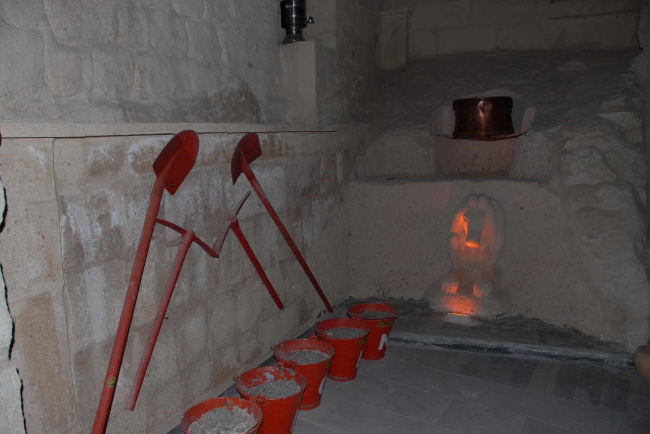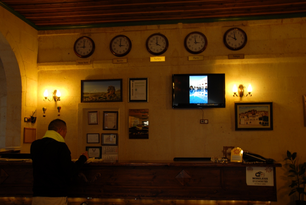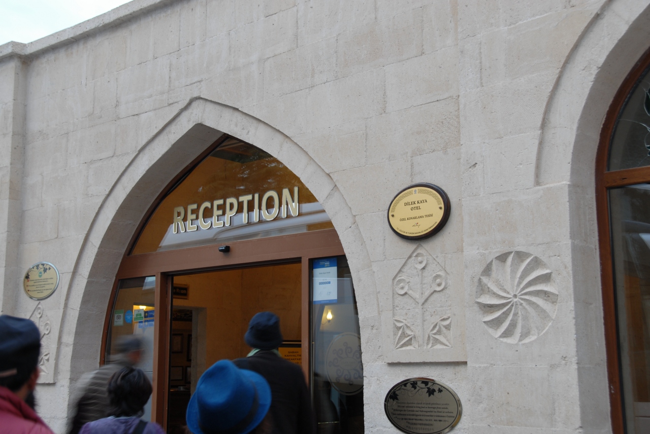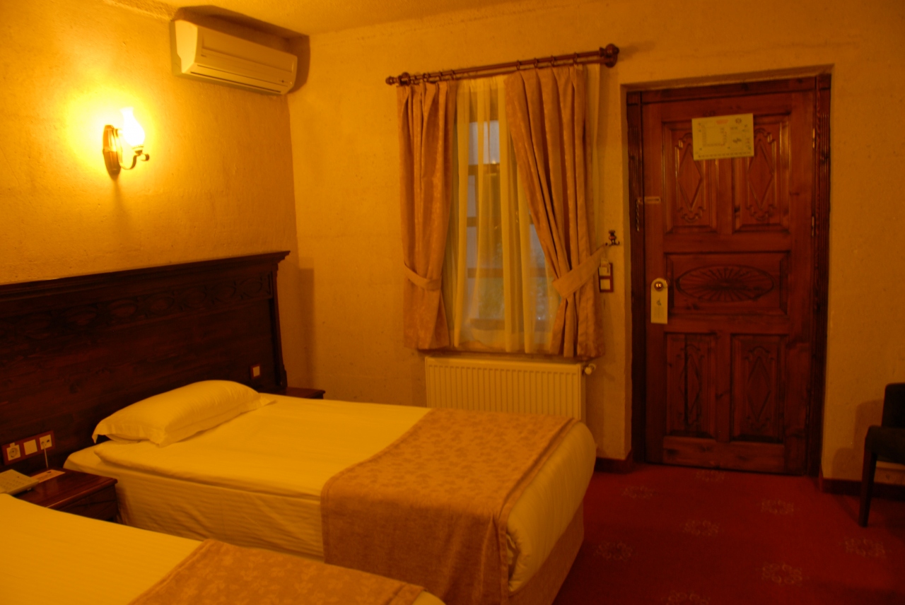 奇岩で有名なカッパドキアの町の中にある洞窟風のホテルです。ホテルに面した道路からは洞窟風を感じさせない造りになっています。ロビーはそんなに広くはないです。部屋へ向かう通路や階段は洞窟造りを思わせるような造りになっています。部屋はドアから内装まで映画のホビットにでてくるようなかわいい感じです。木目を生かした家具やドアが印象的です。エアコンは部屋ごとに独立していて、自由に調節できます。ベッドはそんなに大きくはないですが、ゆったりと横になれます。ただ一つ困ったのは、トイレの水が流れなかったことです。さいしょの一回だけ流したら、その後は流れなかったです。やむなく、バスタブのシャワーノズルを伸ばして流しました。夕食はインテリアがトルコを思わせるように置いてあるレストランで食べました。トルコ料理で味もよく美味しく食べられました。朝食は別棟の2階のレストランでいただきました。食後、外へ出たら小さな窓がある奇岩があちらこちらに見ることができました。
