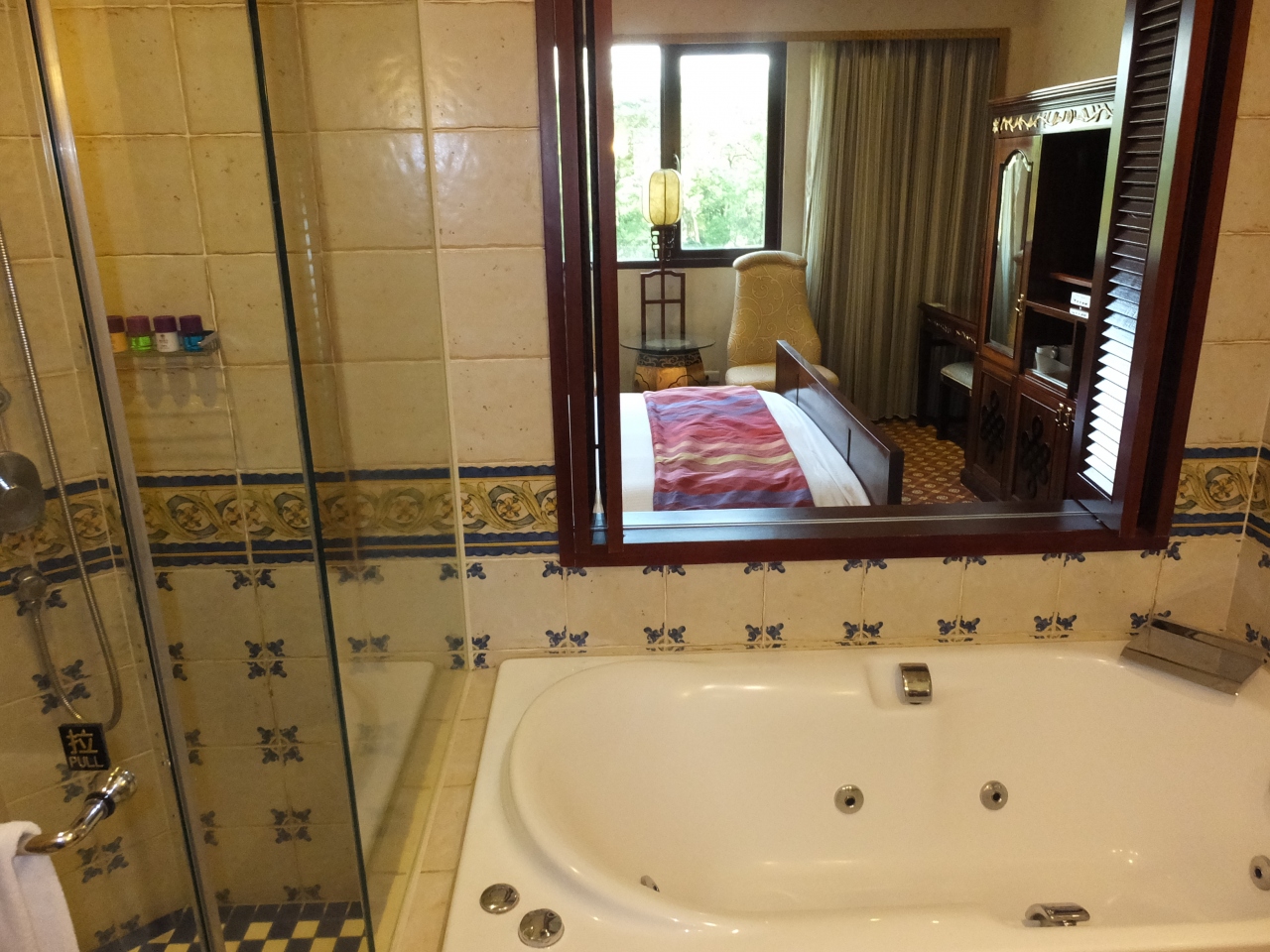 部屋について,アメニティーは全て揃っています。しかし,金庫,バスローブがありません。シャワーブースがあります。バスタブはジェットバスですが,シャワーがないので,ジャグジーとして使うことしかできません。湯はすぐに出ます。バスタブと部屋の境は,鍵のない木製のブラインドのようなものです。目の前が幹線道路だからか,無感地震のような揺れがあり,電気スタンドがカタカタ揺れていました。車の音は少しだけ聞こえます。テレビの日本語放送はありませんが,日本の民放番組を再放送するチャンネルが一つあります。
