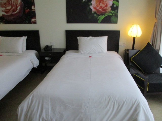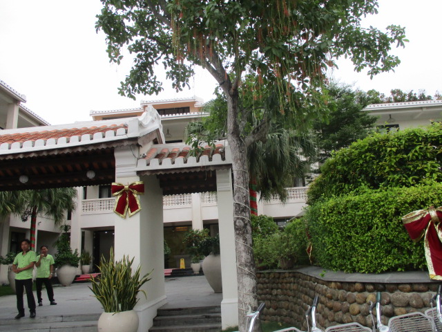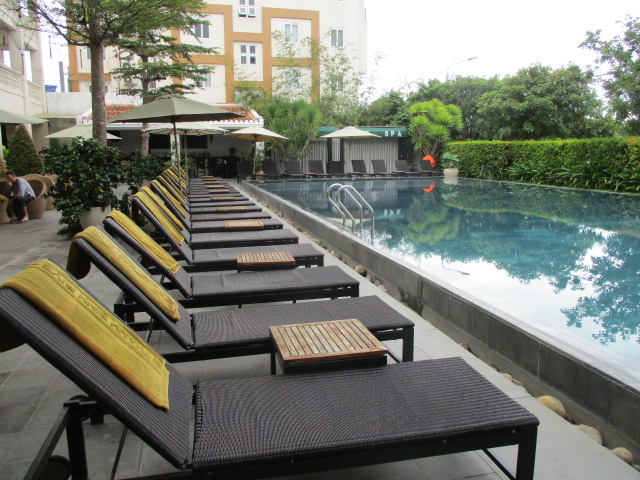 まだ新しいホテルです。入り口の前が川です。入ってすぐに大きなプールがあり、プールサイドだけ見るとリゾートの雰囲気ですが、市中のホテルです。ホテルの後ろにはローカルの若者の集う飲食店が並び、昼間より夜、賑わっています。日本人も欧米人も中国人も偏らず泊まっている感じでした。ホイアンの夜歩きには道が暗くないので便利な立地です。このホテルの隣にもホテルができるようでした。リバーサイド、ってありますが、この前の川はホイアンのランタンが賑やかな小さな川の続きなので、リゾート感を重視なら、大きな川沿いのホテルの方がよいと思います