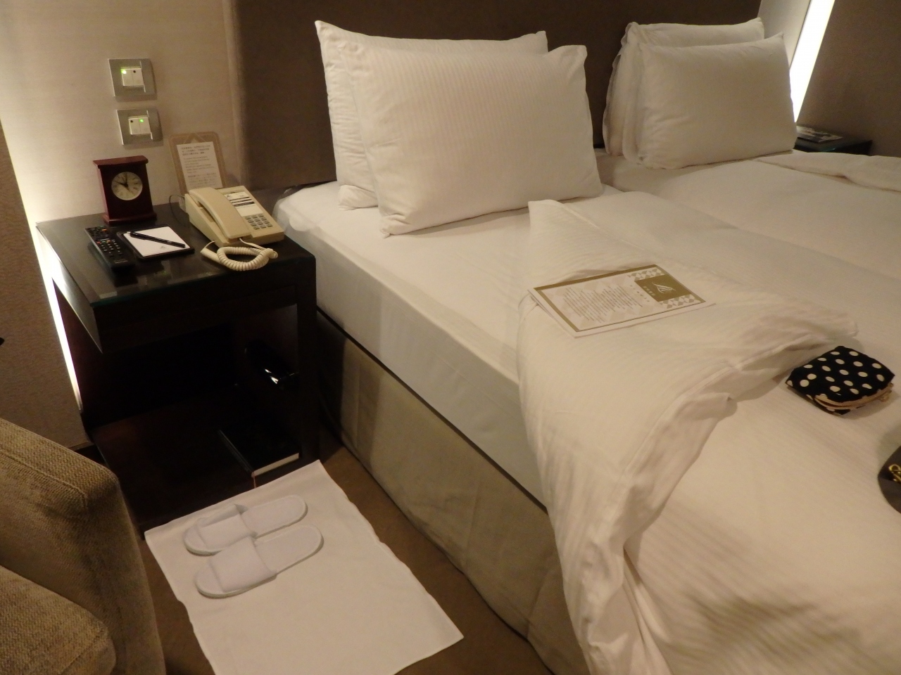 また写真の通り、ベッドの脇にはスリッパとその下に清潔な布がひかれていて