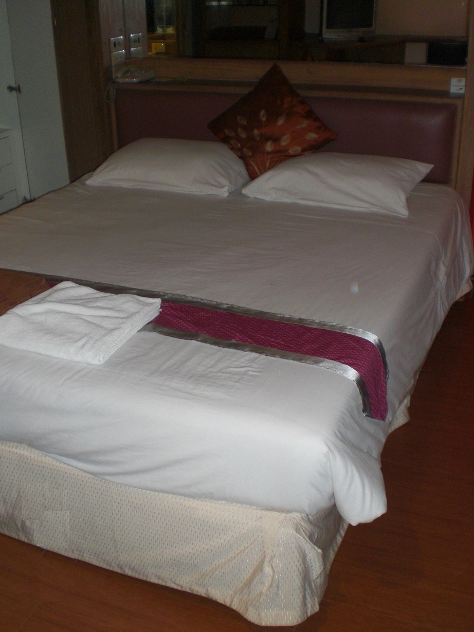 客室のベッドの様子です。ホテルの外観とは雰囲気が異なります。