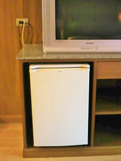 客室内の冷蔵庫とテレビの様子です。白色の基調か映えます。