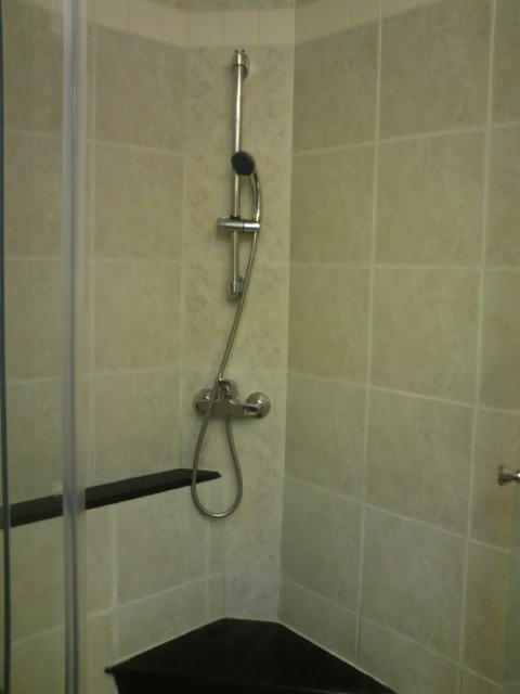 ガラス製の仕切り板の中のシャワーの様子です。湯は、跳ねません
