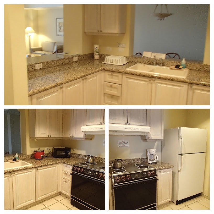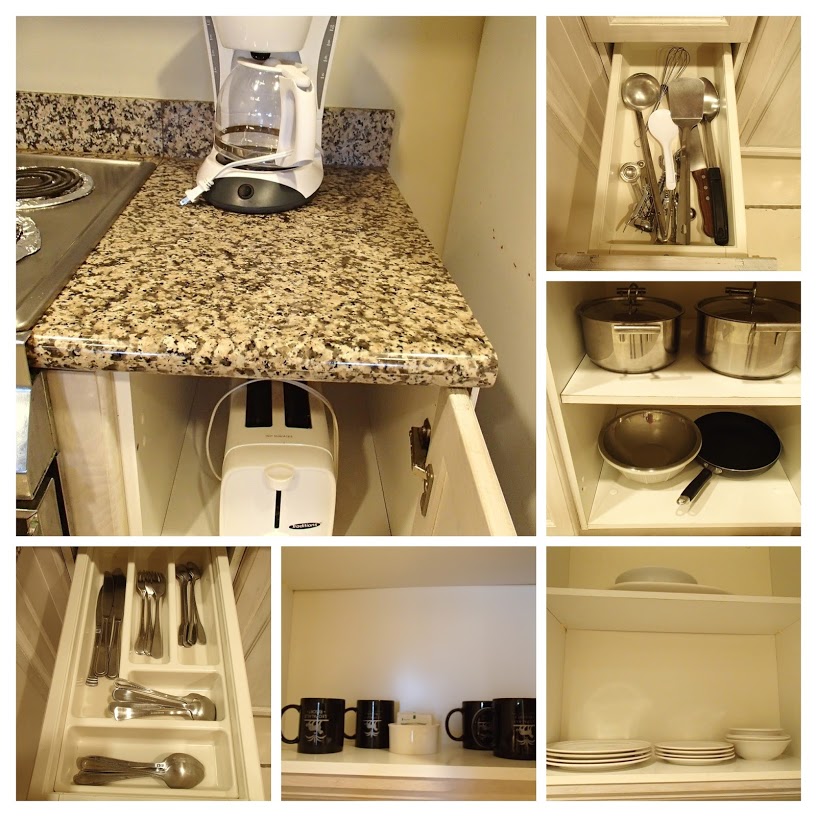 簡易キッチンのあるステューディオタイプなので、多少の調理もできます。ただし熱源は電気ポットとホットプレート(鉄板は浅いのと深いのと2種類あり)のみで、冷蔵庫は1ドアでコンドミニアムと考えると小さいです。