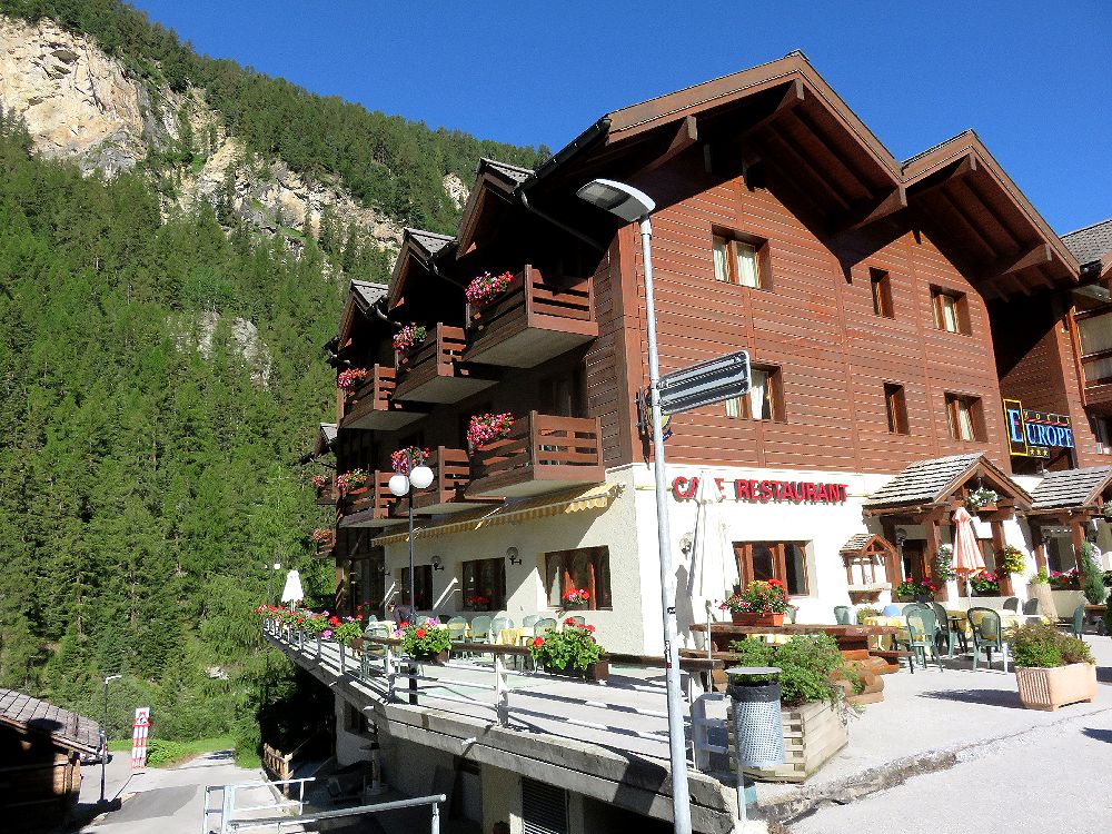シエールから入ったアニヴィエの谷の最奥の村ツィナールにあるホテル。ソルヴォアに上がるロープウェイの駅に近く、部屋の窓からはベッソが目の前に見えるロケーションにあります。私達はレンタカーで来ましたが、ホテル裏に広い駐車場があり、楽に駐車することができました。実は予約したのは別のホテルでしたが、思いがけずアップグレードされて、向かいにあるこのホテルに宿泊させていただいたのです。