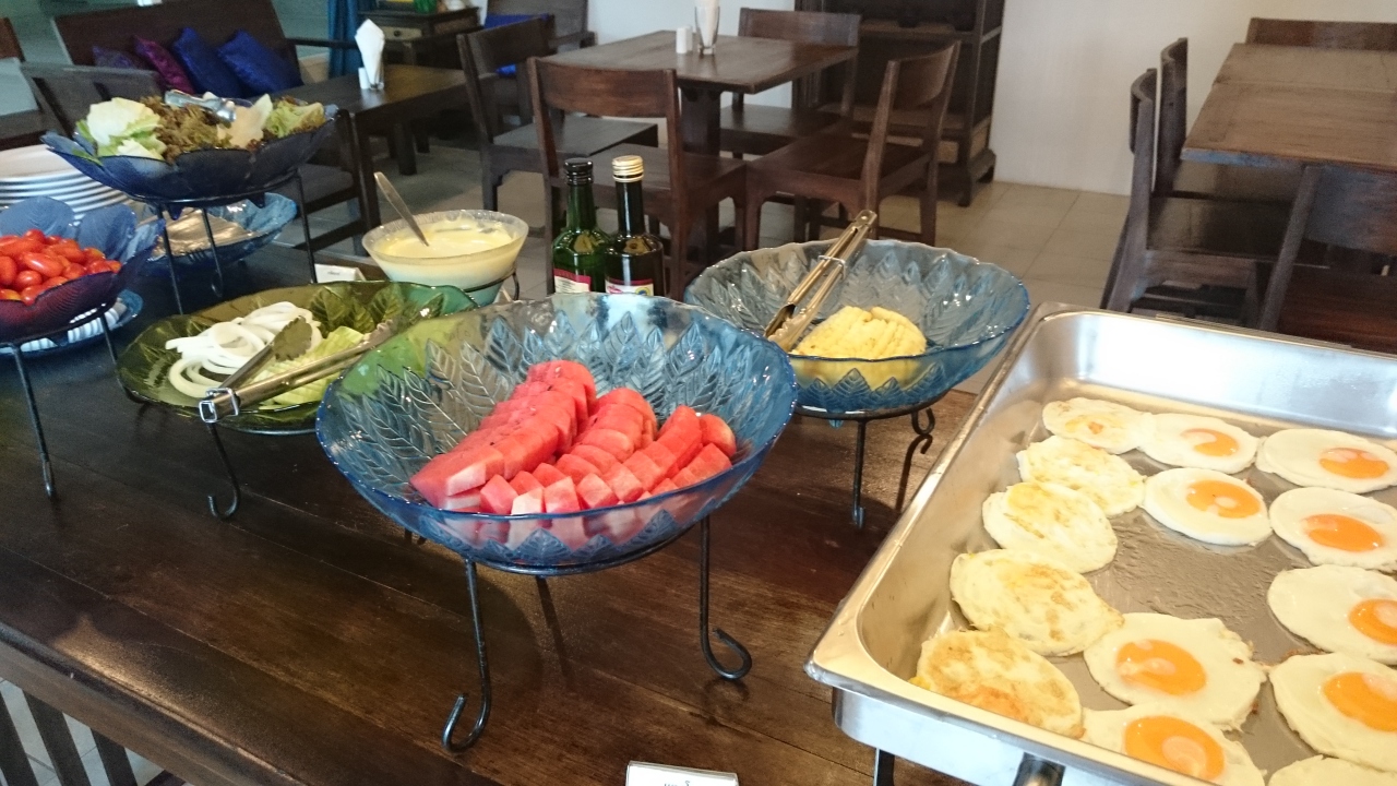 いちばんダメだったのが朝食で、生野菜サラダ・ハムとウインナー・目玉焼き・シリアル・トースト・フルーツでおいしくありませんでした。
