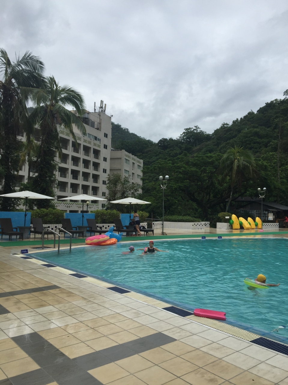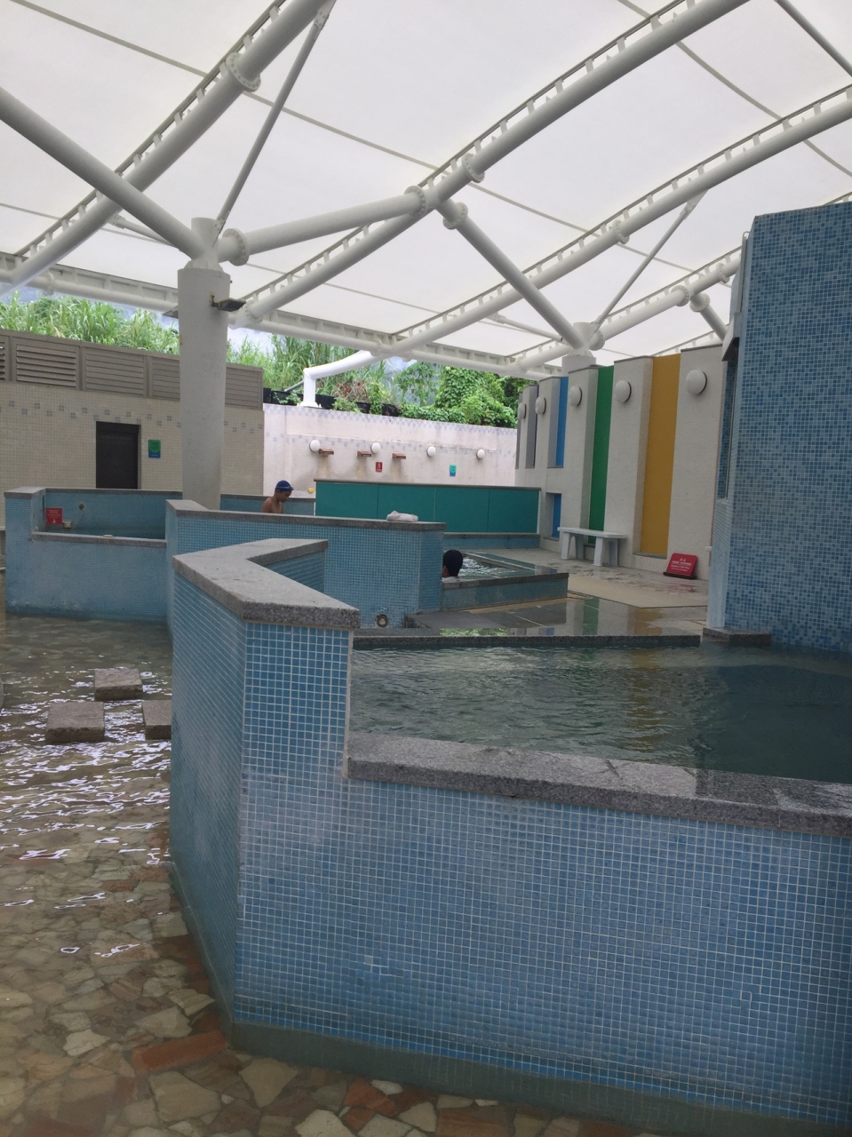 高雄から自強号ーバスーバスで行ってきました。1人400ドル、水泳帽子込みです。水着着用。バスタオルは貸してくれました。シャワー完備。風呂の温度が低いので、プールでマジ泳ぎして体温あげました(^_^;)あいにくの雨でガラガラです。のんびりしましたー。