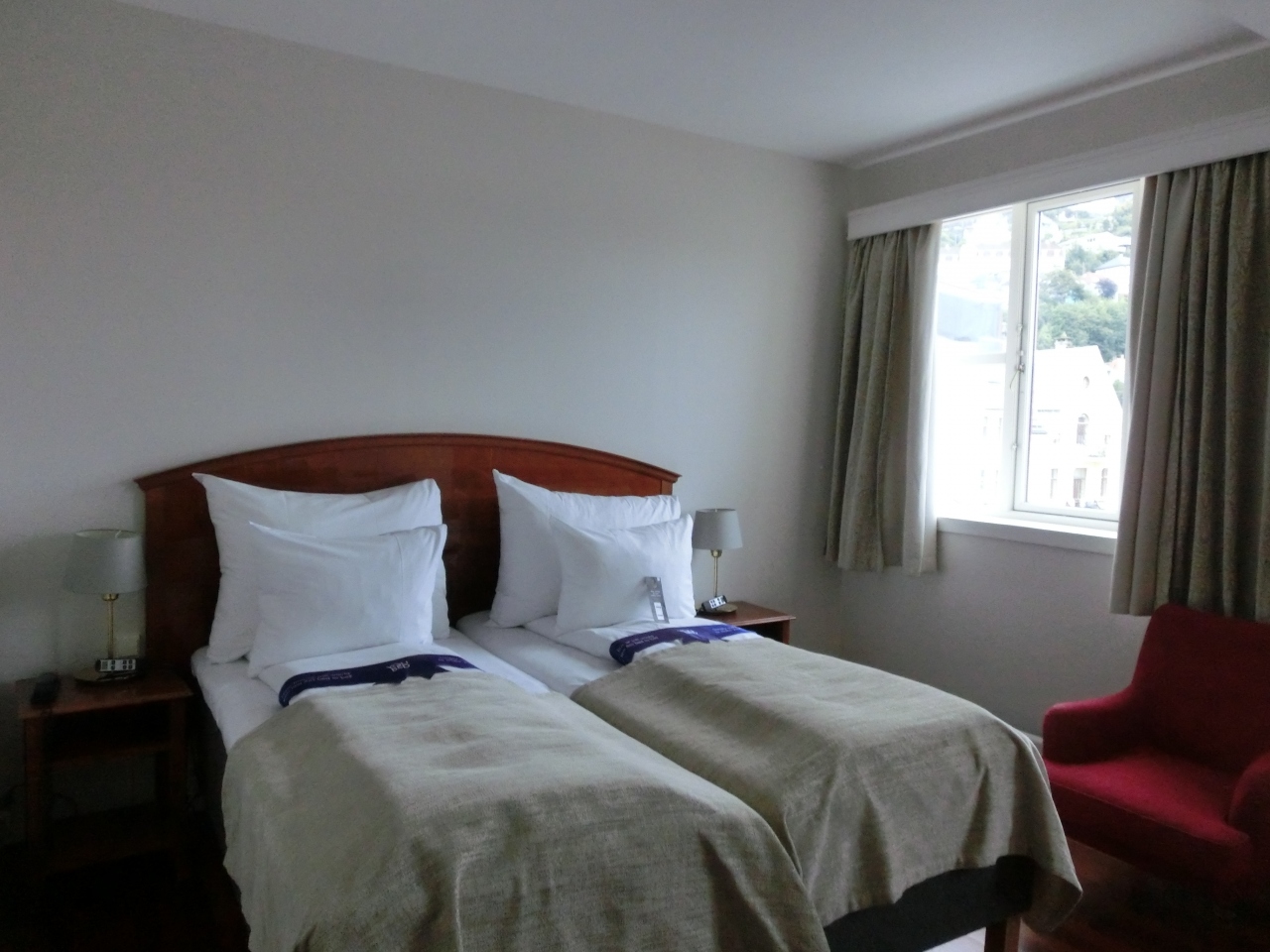ブリッケン地区にあるなかなかいいホテルです。最初に案内された部屋がシャワーのみ、やたらと狭い屋根裏部屋で、がっかり。フロントでチェックインのときはバスタブつきの部屋の旨確認したのですが、変えてもらおうと再度フロントに行きました。が、この日は満室で、翌日2時以降だったらなんとかなる、といわれました。最初からシャワーのみの部屋だといってくれれば、その時点で交渉してたのに・・。予約サイトでバスタブつきとリクエストいれてたのですが、反映されてませんでした。翌朝10時ごろ、荷物をまとめてフロントに行くと、バスタブつきの部屋を見せてくれて、気に入ったかどうか確認してから、交換してもらえました。今度は広い眺めのいい部屋で、残りの滞在はとても快適でした。朝食は種類は割りとありますが、正直いまいちです。まあノルウェーの基準では普通以上なのかなとは思います。フリーで、水と炭酸水、コーヒー、紅茶が飲めるようになっていて、部屋にも持っていけるので便利です。