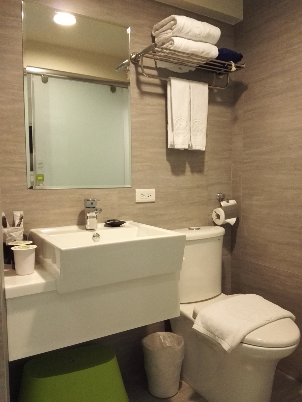 食事は、モスのサンドイッチ(台湾風味)と、ダイニングスペースにあるフリードリンク(コーヒー、紅茶など)で期待外れ。でも周辺には店が沢山あり、ホテルの並びに豆花の店もありました(食べてませんが。)食べに出るのが良いです。