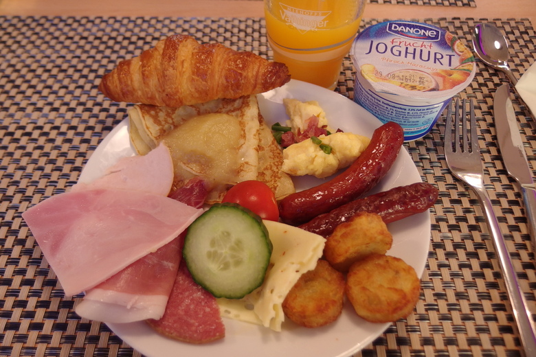 ヒルデスハイムで連泊する予定でしたが、ICEでヒルデスハイム停車便が時間も予算も合わず、ハノーファーで泊まることにしました。駅裏ですが線路に沿った感じでちょっと歩きます。ノボテルは何度も泊っていますがスイートは初めてです。写真の白熱灯下でのインテリアの色映えが悪いせいで、古めかしいブランドなのかと思っていましたが、実際はよかったです。とにかく広いです。4名分のベッドが占めるのにまだ余裕があります。90cm幅ベッド2台、160cm幅ベッド1台です。シャワーつきバスタブとシャワールーム、トイレがそれぞれ別で、洗面シンクと電子レンジ上に手洗いシンクがあるので、人数が多くても待たなくていいです。こちらは朝食券制でした。もちもちしたクレープにリンゴピューレをつけておいしかったです。朝食もかなり揃っており味もおいしいです。裏に巨大がスーパーKauflandがあり6-24時(土は23:30、日休)の営業と書いてありました。