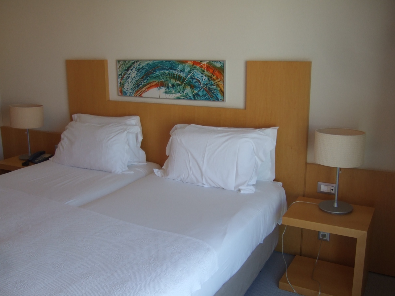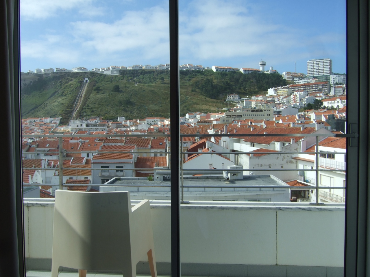 ナザレでは一番近代的なホテルらしく、ロビーも広い。サイドシービューという部屋を予約したら、部屋はシティオ地区に向いていて、ケーブルカーが真っ正面。バルコニーに出ると、岬と大西洋が見えて気持ちよい。