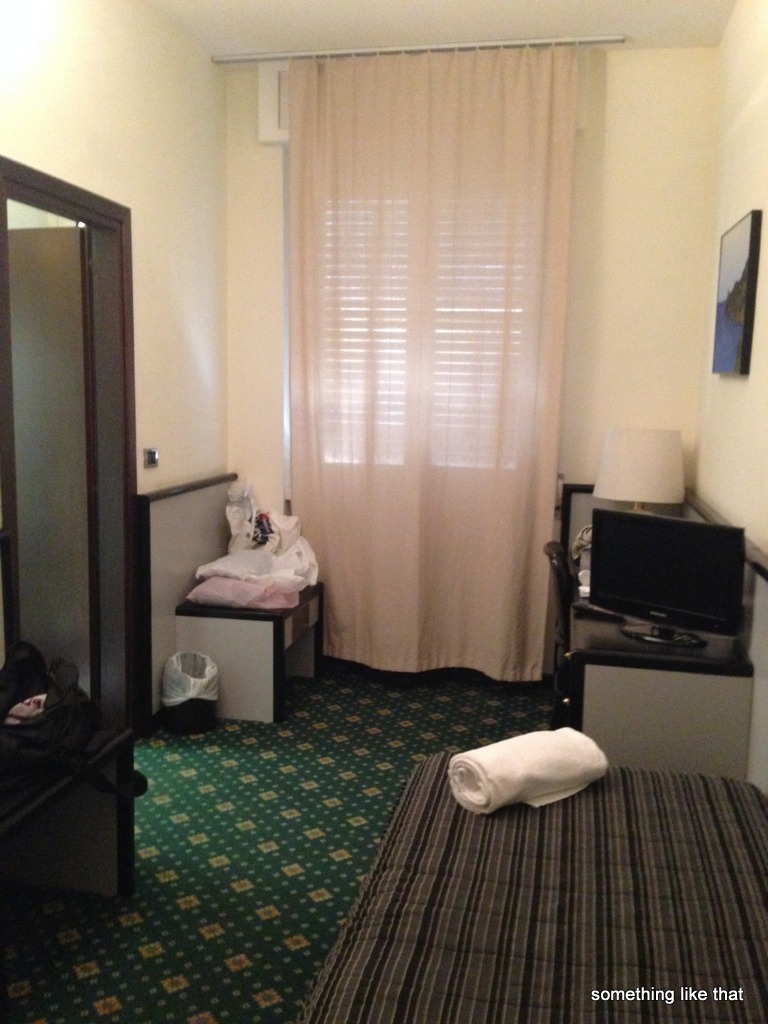 ミラノ駅前のホテル。建物の一部がホテルとして使用されており、入り口がやや分かりづらい。表示が上の方にあるので、気を付けないと行き過ぎる。フロントは対応がいい。全体的に古いホテル。シングルを利用したが、ベッド、小さいTVが置いてある程度。シャワー、トイレ付き、バスなし。至ってスタンダードだが、駅前の立地場所のお陰でやや割高なんだろう。朝食も最低限揃えたと感じ。泊まるだけなら全然不満はない。