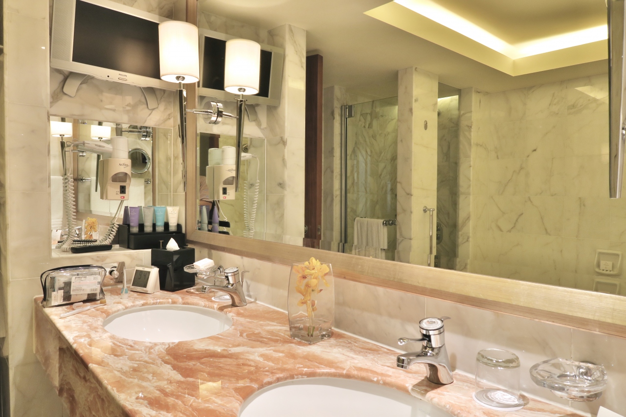 部屋はだいぶ狭く古い感じがしますが、マリオットやUpperHouseを下にした眺めは非常に良いです。デスク周りではUSBコネクタは無いですがコンセントは100V、220Vとあるので日本のがそのまま使えます。オーディオ(時計?)とか冊子とかごちゃごちゃしており何か狭いし、椅子も使い勝手が悪くビジネスとかで作業するにはちょっと微妙。