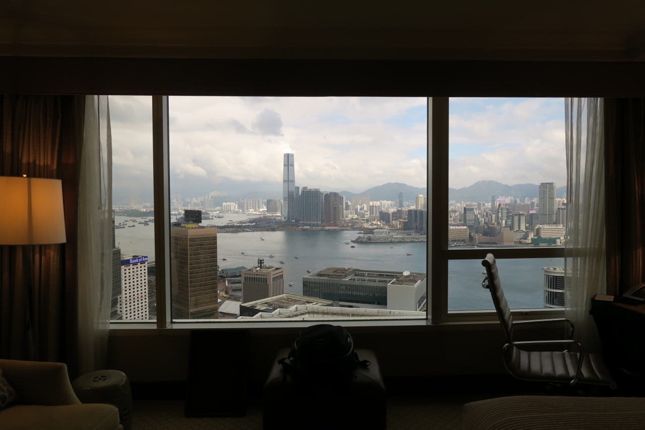 ステータスマッチでダイヤモンドを貰ったのでヒルトン系に初めて宿泊してみました。予約は一番安価な部屋(KING BED SUPERIOR ROOM)にしましたが、それでも税込みHK$2460でした。当日は朝9時からチェックイン、事前のアプリによる部屋選択では46階ハーバーまでしか選べませんでしたが、当日はダイヤモンドということで、最上階下でハーバーが見える58階のエグゼクティブキングにアップグレード。